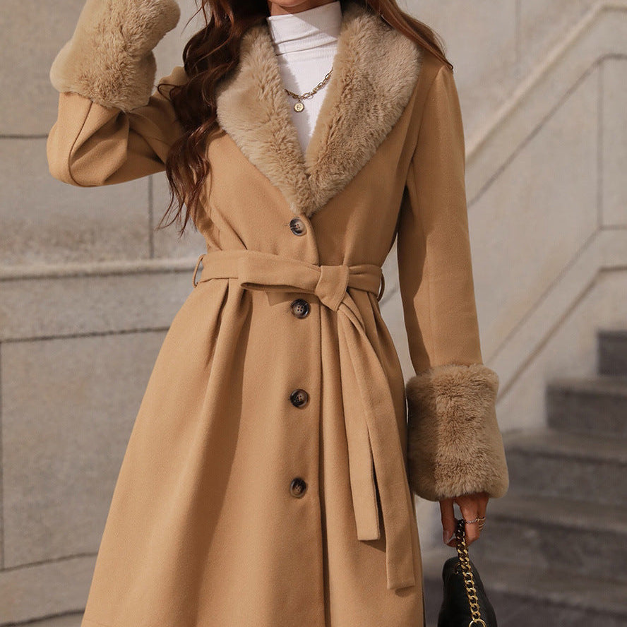 Mellemlang trenchcoat med pelskrave og bælte