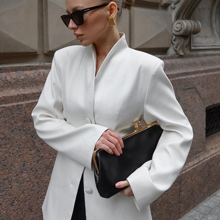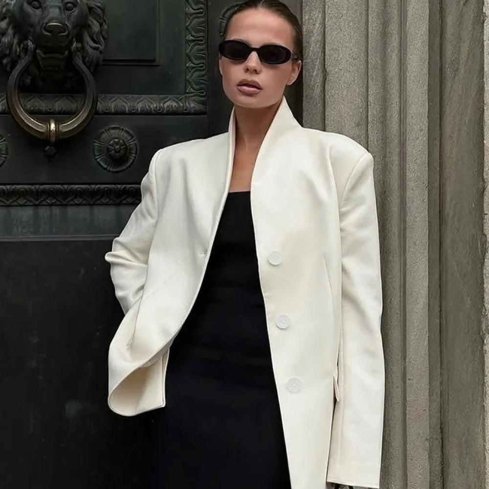 Minimalistisk hvid frakke med V-hals, elegant og afslappet