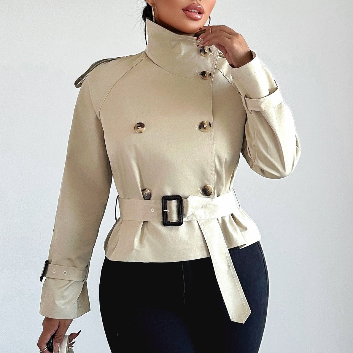 Afslappet kort trenchcoat til kvinder med spændekrave og bælte