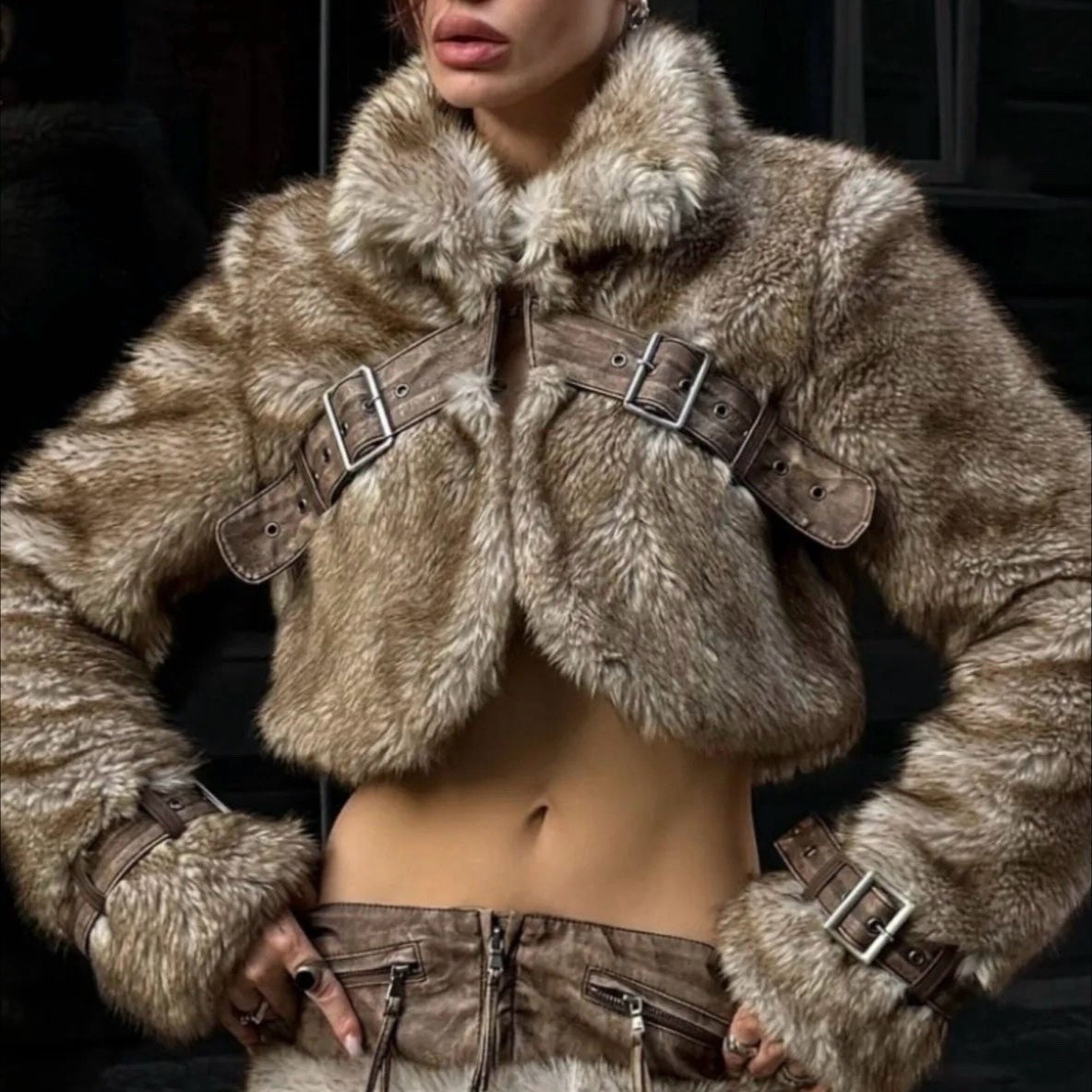 Vintage Y2K-jakke med pelskrave og tætsiddende lædertalje -