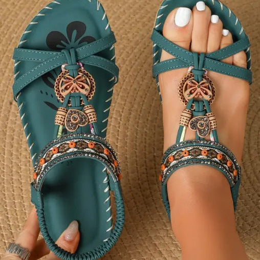 Damesandaler – Flad sål – Elastisk rem – Boho chic perler og krystaller