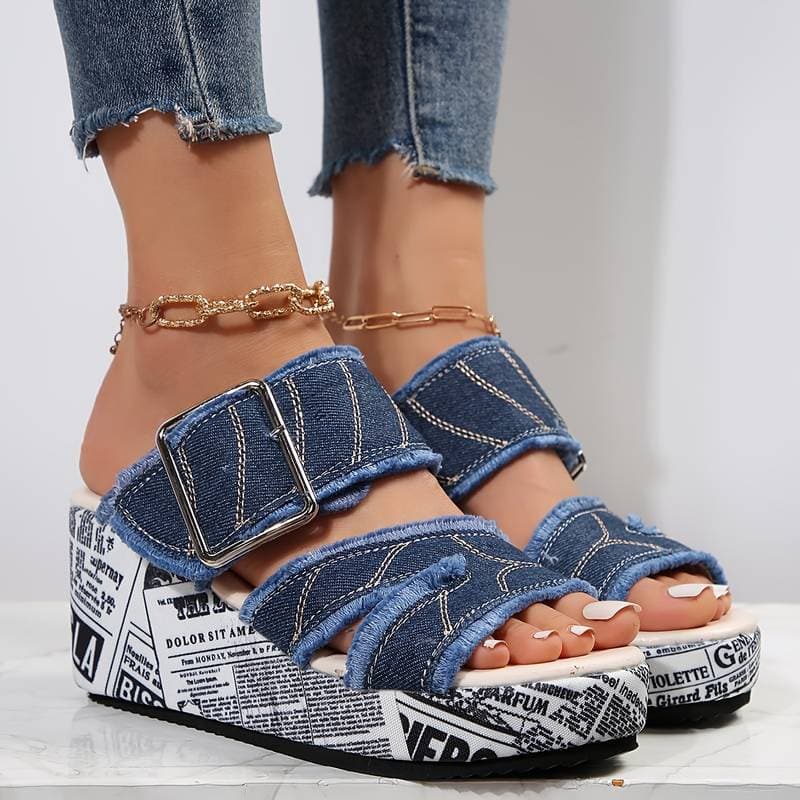 Damekilehæl - Flosset denim - Trykt høj sål - Åben tå