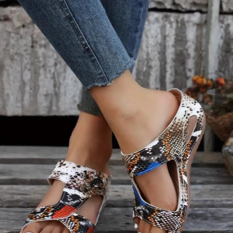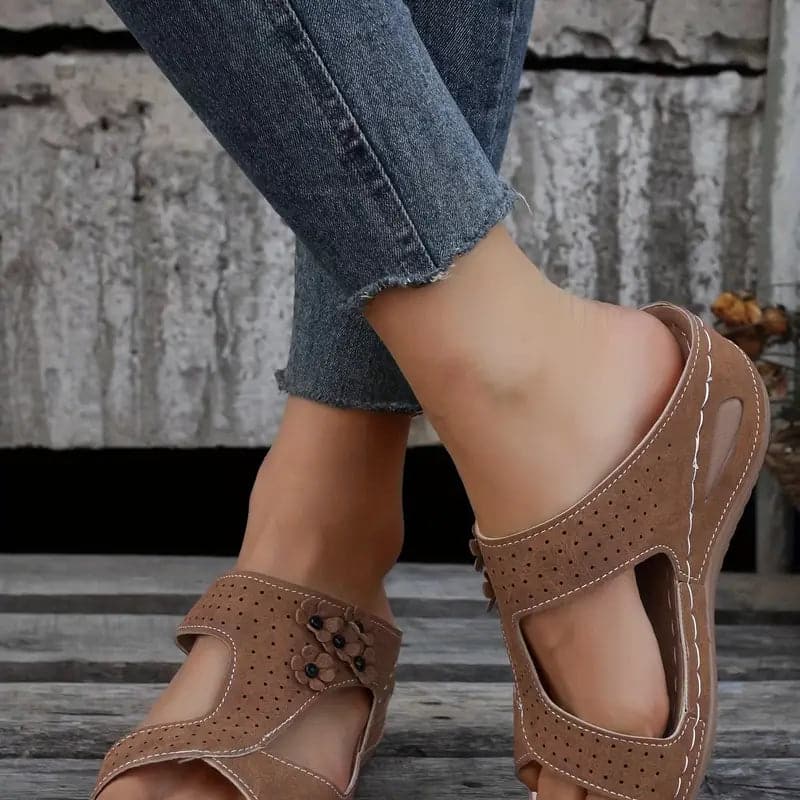 Damesandaler med kilehæl - Perforeret læder - Polstret komfort - Åbent blomsterdesign