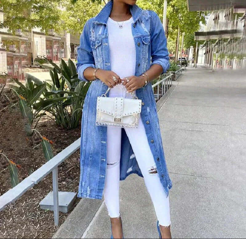 Dametrenchcoat – Afslappet lige snit – Denim – Slidte detaljer – Maxilængde