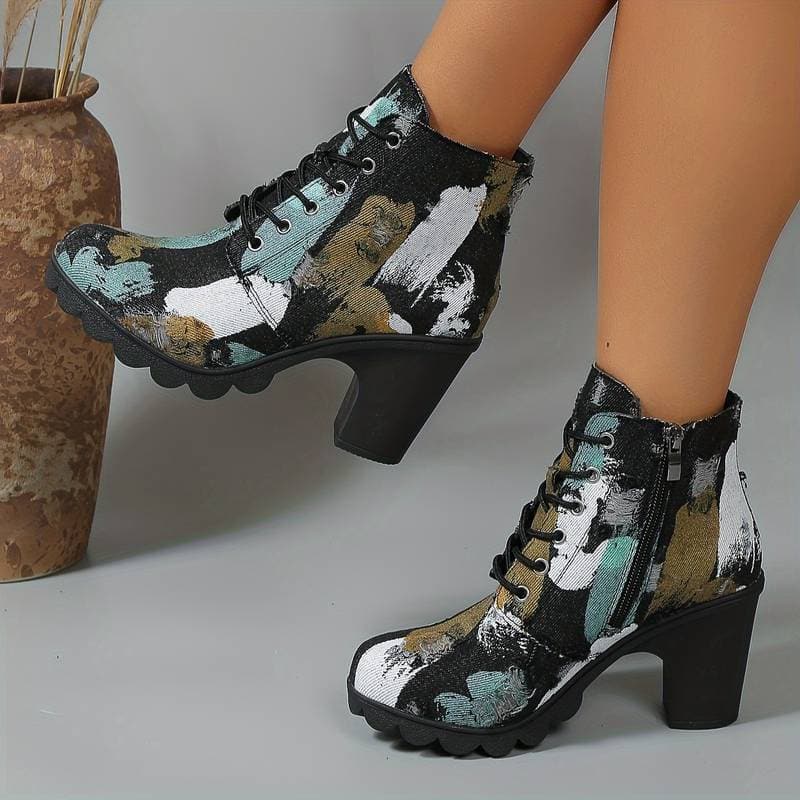 Dameankelstøvler - Blokhæl - Snørebånd og lynlås i siden - Trendy kunstnerisk mønster