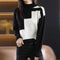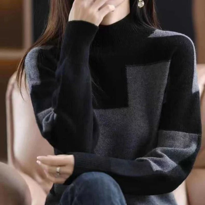 Denne pullover-sweatshirt til kvinder er lavet af blødt strikstof, har en høj hals og en afslappet pasform. Dens lange ærmer og geometriske patchworkmønster gør den til et behageligt og karakteristisk stykke tøj.
