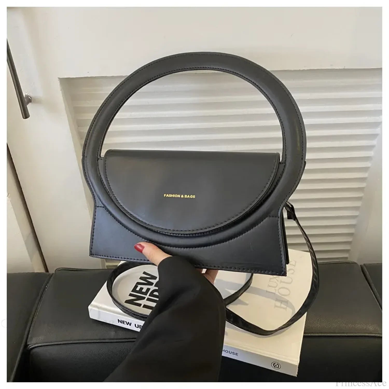 Luksuriøs skuldertaske i læder med rundt håndtag fra et eksklusivt mærke