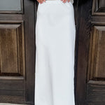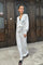 Nederdel i acetatsatin med lange ærmer og V-hals.
