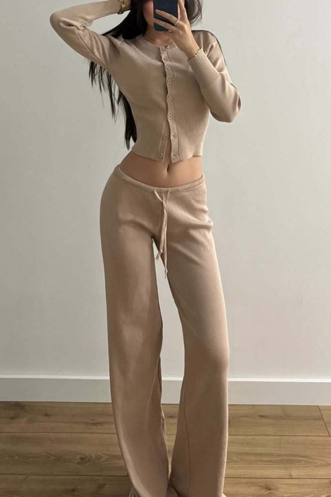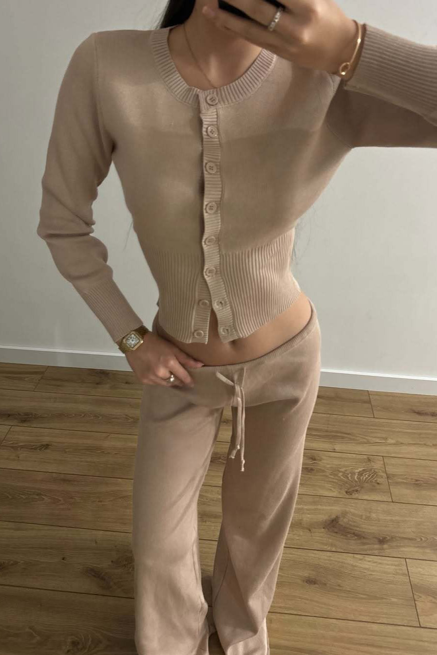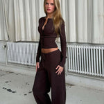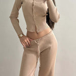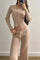 Sexet todelt mesh-sæt, tætsiddende og knappet, med lange ærmer og lav talje