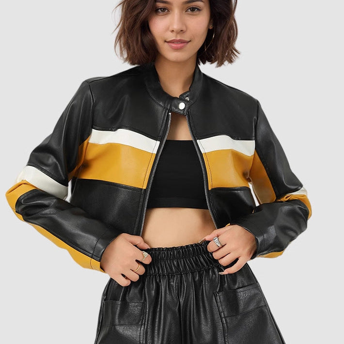 Farveblok PU kort jakke