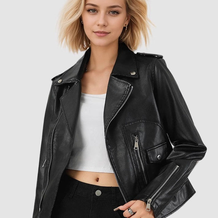 Kort PU-læderjakke med lynlås