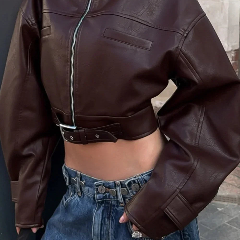 Retro kort bikerjakke i læder med opretstående krave og lynlåslukning