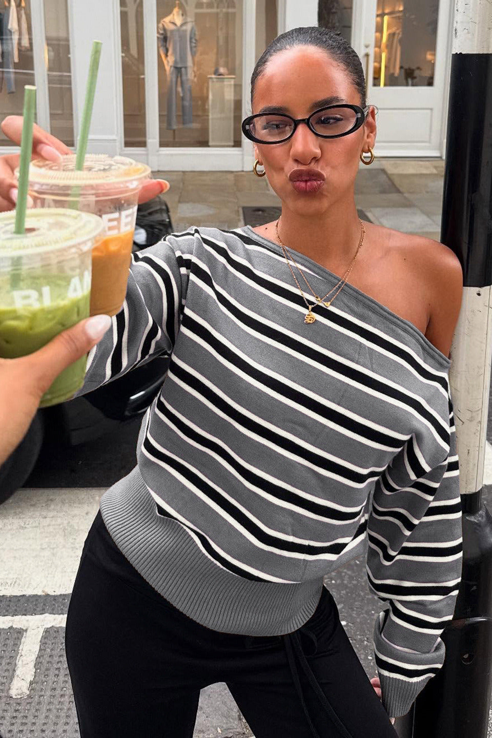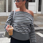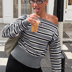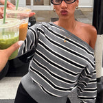 Stribet off-shoulder, langærmet sweaterbluse, farveblok
