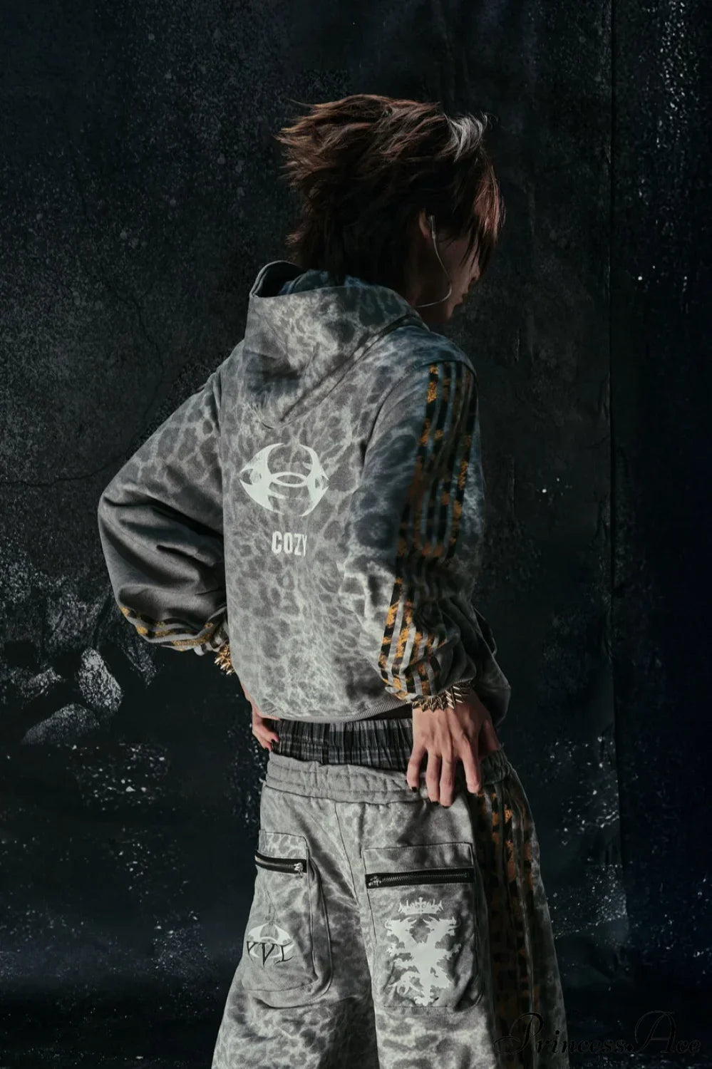 Y2K hættetrøje med leopardstriber og lynlås