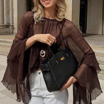 Løstsiddende chiffonbluse med flæser og rund hals
