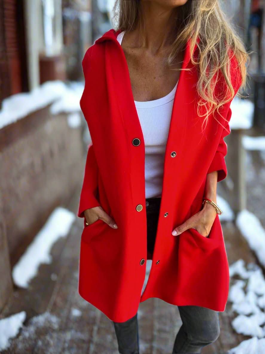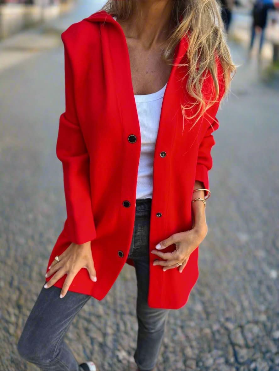 Den dristige røde farve er en selvtillidsboost, der får dig til at skille dig ud fra mængden. Ideel til at have på over lette toppe eller kjoler, er den et must-have i garderoben. Uanset om du løber ærinder eller skal til brunch, er denne jakke ubesværet smart.