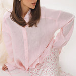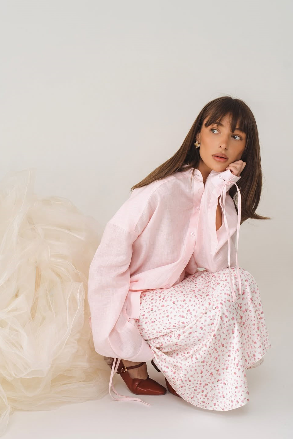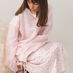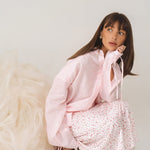 Struktureret lyserød bluse med lange ærmer og bundet talje