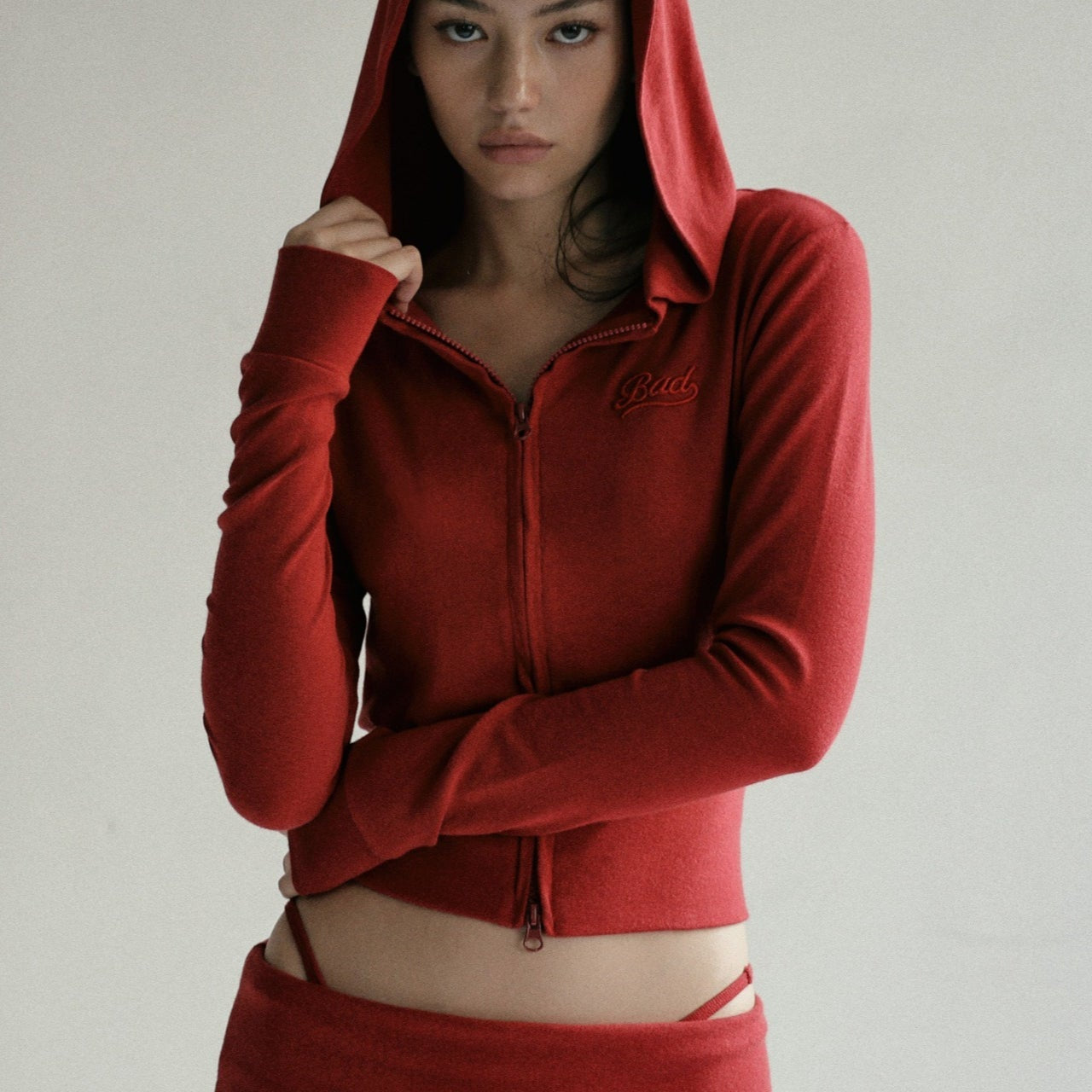 Broderet hættetrøje med lynlås og cropped snit