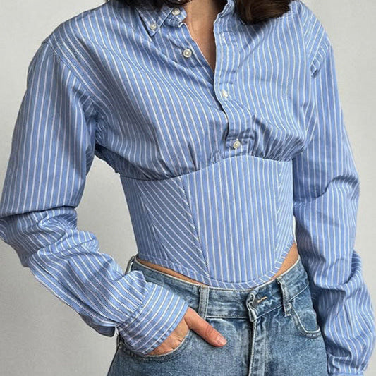 Kort stribet bluse med tætsiddende talje og høj hals