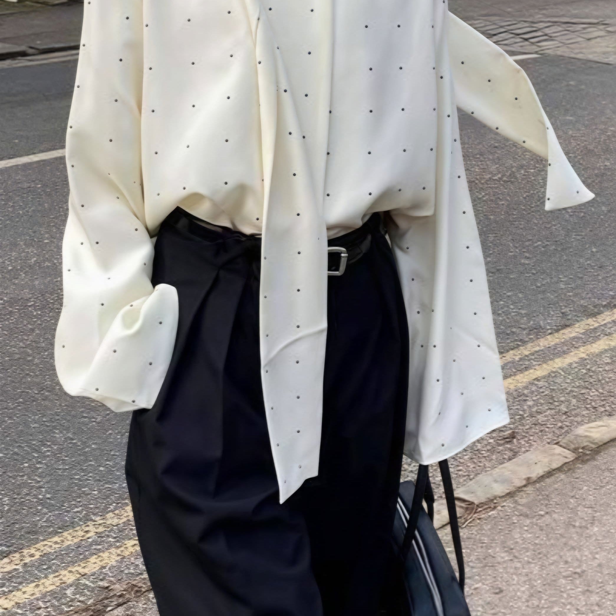 Løstsiddende bluse med polkaprikker og bånd, ideel til hverdagsbrug.