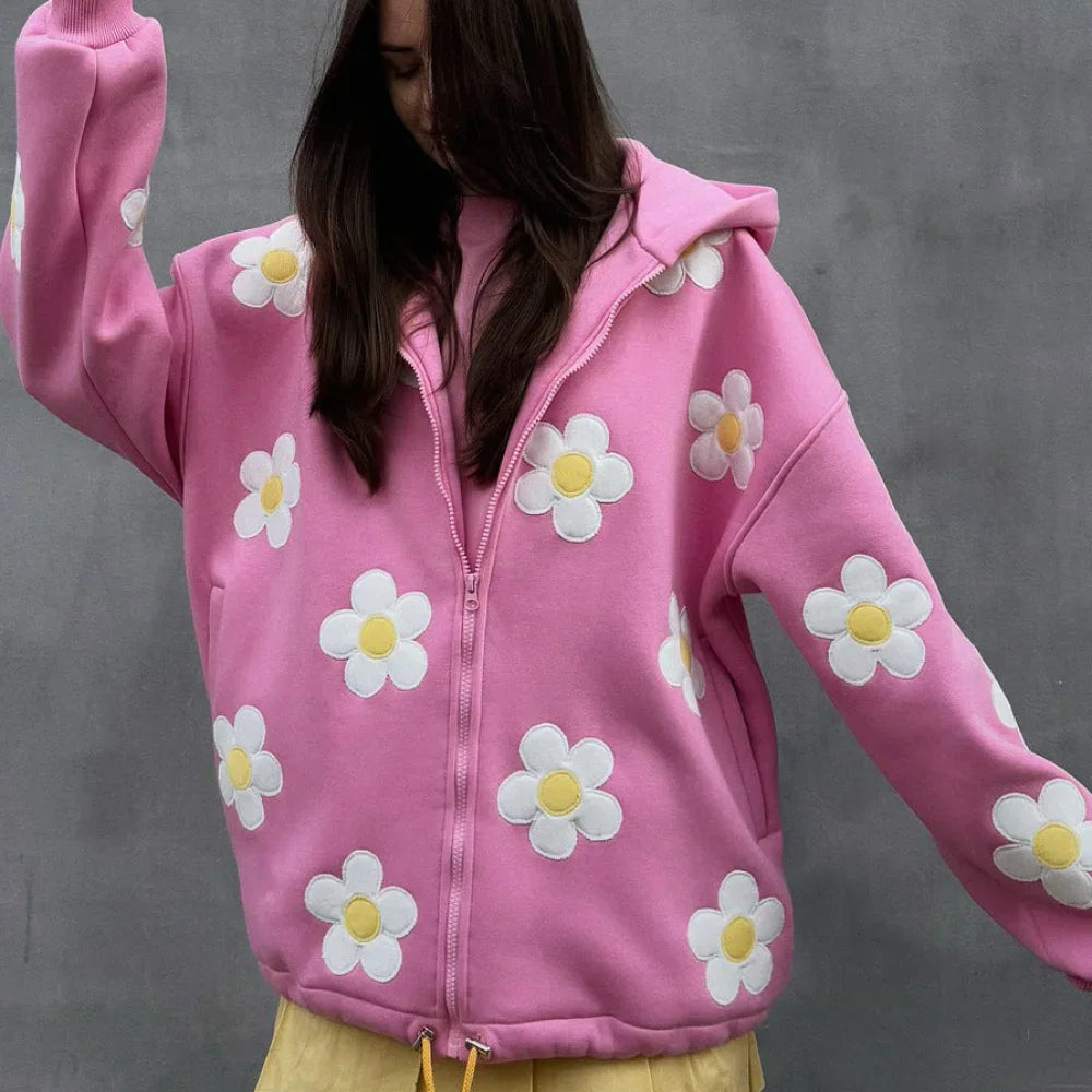 Oversized hættetrøje med lynlås og blomsterapplikation