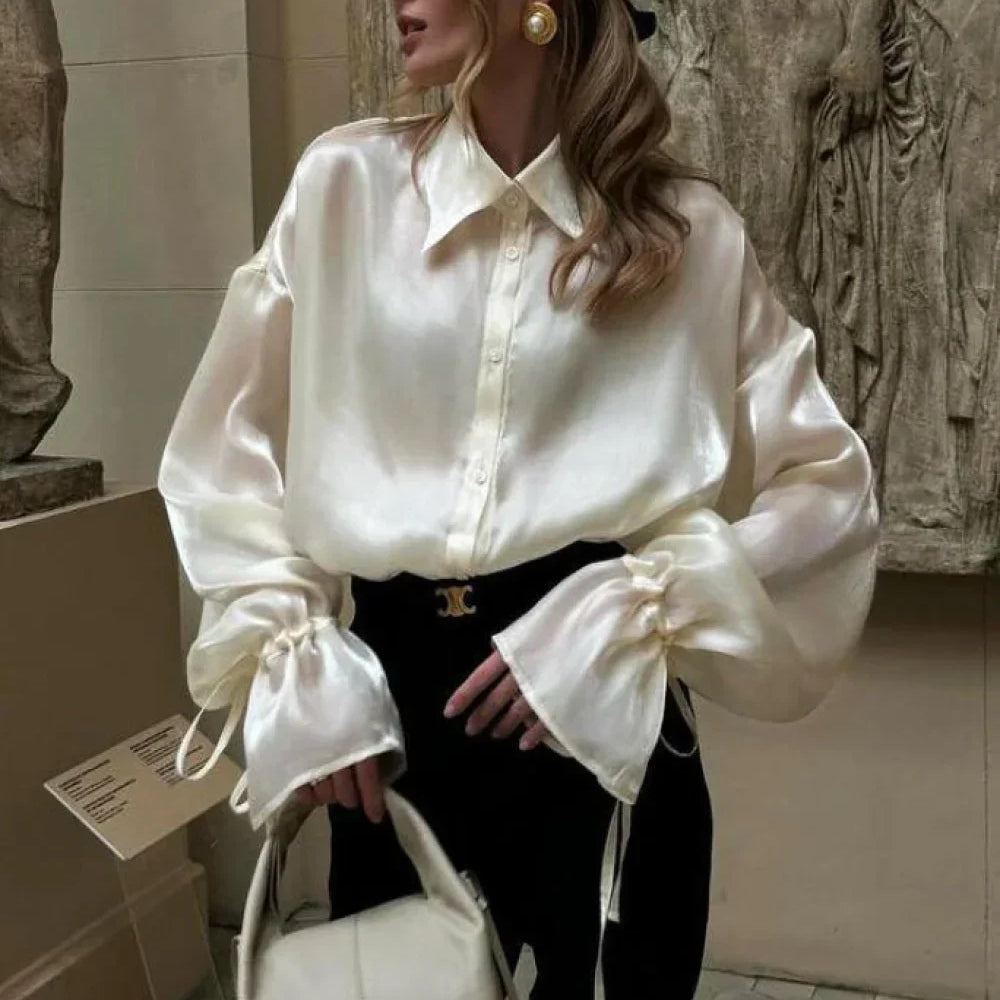 Elegant satinbluse med lange ærmer og bundet talje, løs pasform med bindebælte