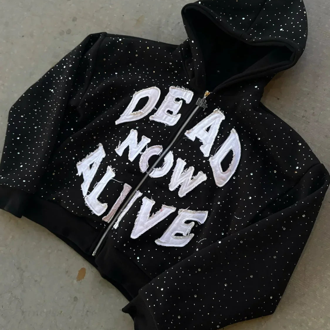 Komfortabel hættetrøje med lynlås og grafisk mønster