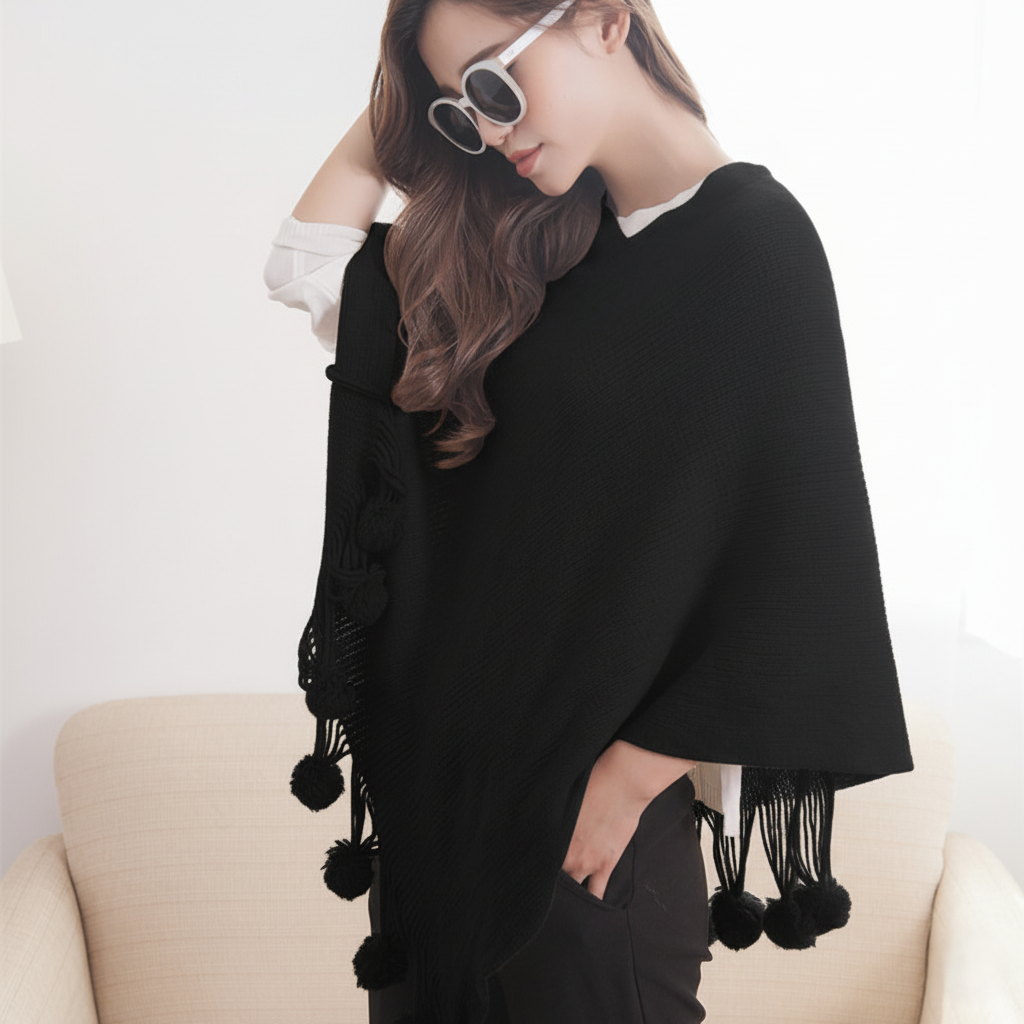 Dameponcho - Kappe med frynser og pomponer - Komfortabelt lagdelt sjal
