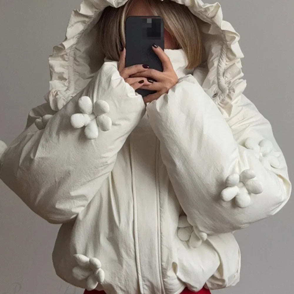 Kort quiltet frakke med hætte og 3D-blomsterflæser