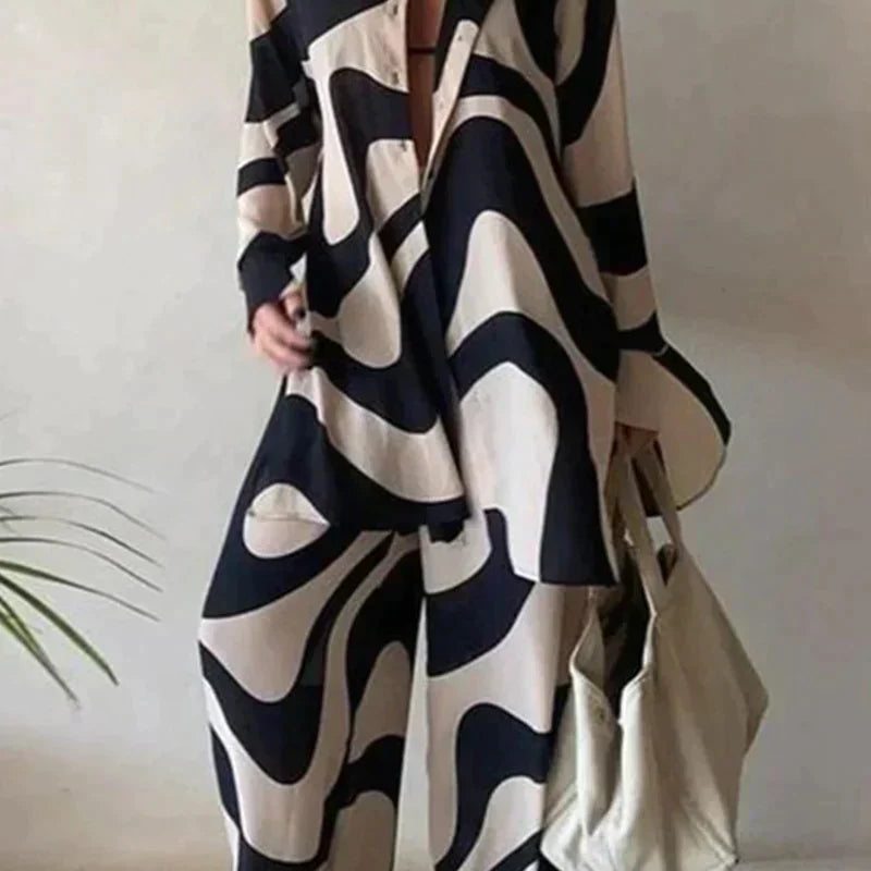 Damesæt – Oversized langærmet skjorte og højtaljede bukser med vide ben – Chic og komfortabelt