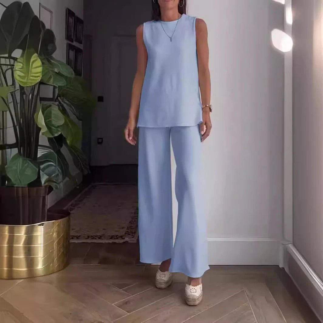 Sæt med ærmeløs bluse og palazzobukser til kvinder – afslappet pasform – blød bomuld
