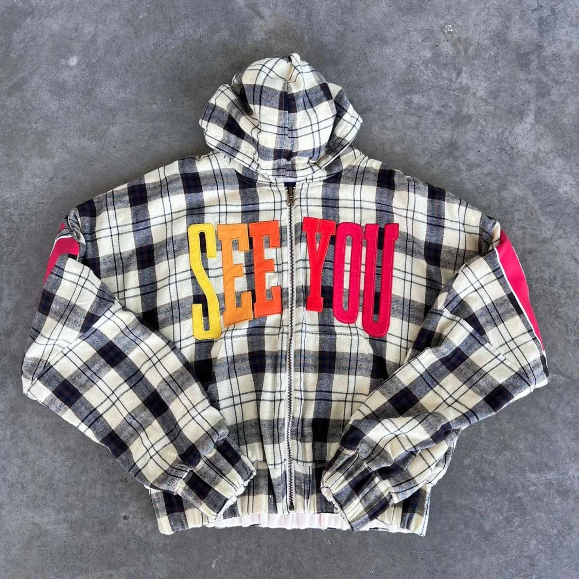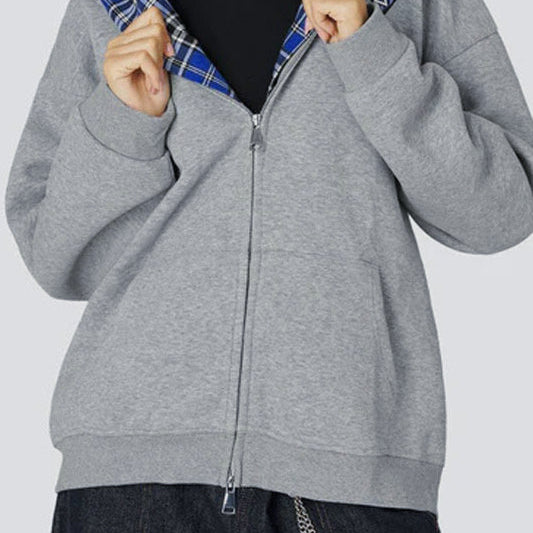 Oversized hættetrøje med lynlås og ternet regnbueprint