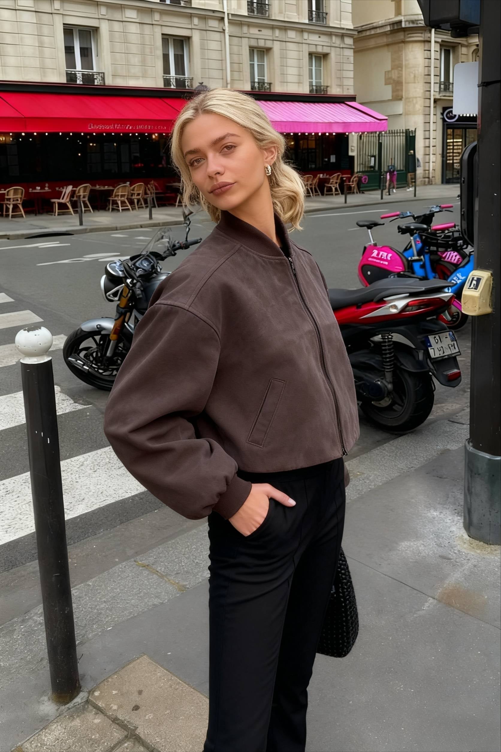 Retro grå ruskindspilotjakke med opretstående krave og lynlåslukning