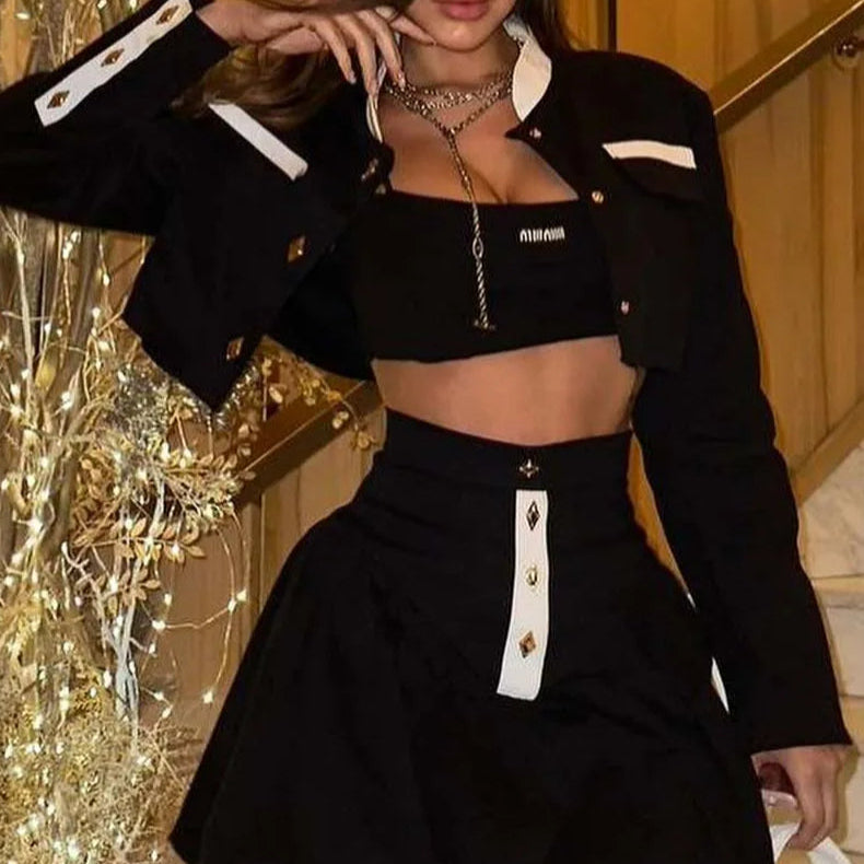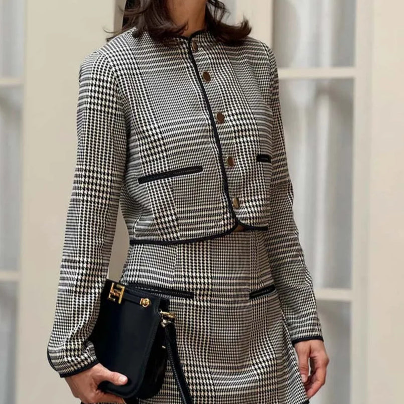 Todelt sæt med sort patchwork-miniskørt til kontoret