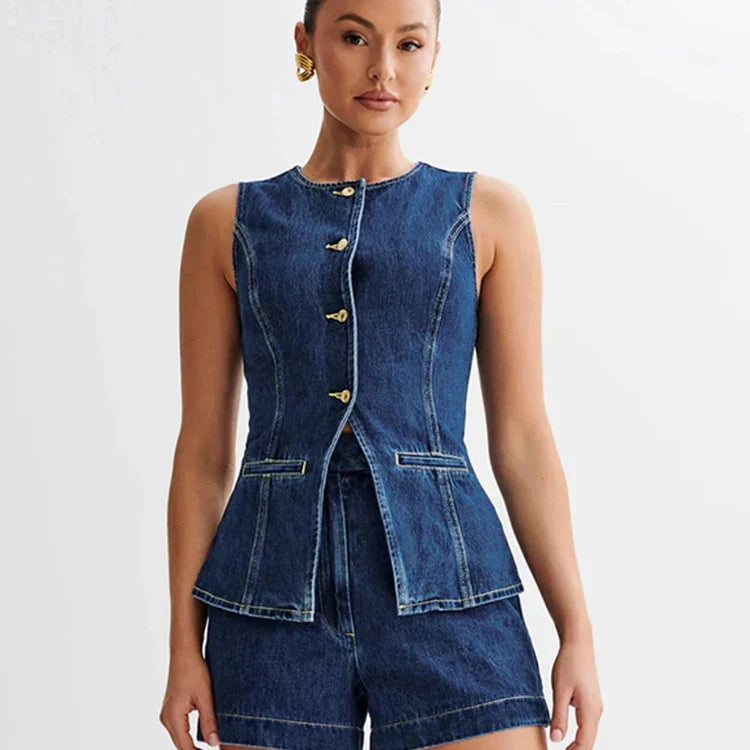 Todelt denimsæt, ærmeløse shorts med rund hals, kontorstil