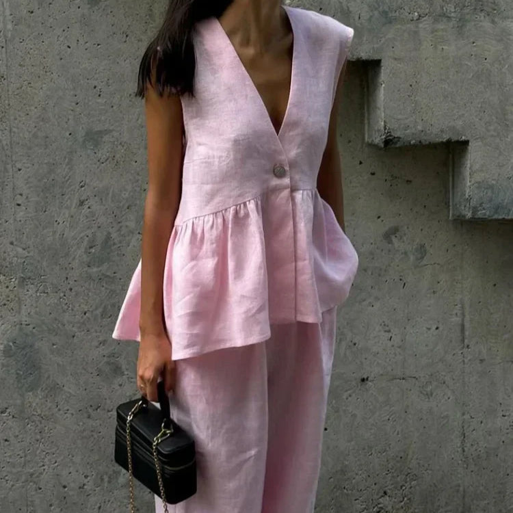 Todelt løstsiddende lyserødt bomulds- og hørsæt til kontoret