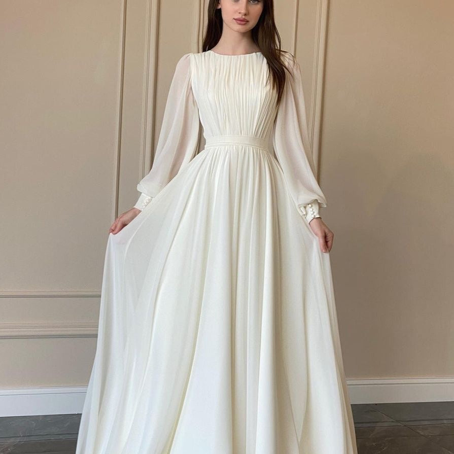 Lang, gennemsigtig kjole med lanterneærmer og perler