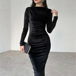 En tætsiddende midikjole med lange rynkede ærmer, elegant og perfekt til efterår og aftener.