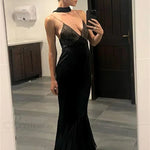 En feminin og forførende midi-aftenkjole, udsmykket med blonder, en dyb V-hals og mesh-paneler, ideel til klubaftener.