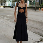 Ærmeløs, tætsiddende midi-aftenkjole med åben ryg og udskåret kant, ideel til fester.