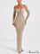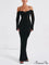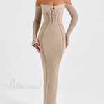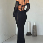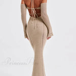 Sexet rygløs kjole med stropper, tætsiddende og elegant snit, lange ærmer og lav halsudskæring.