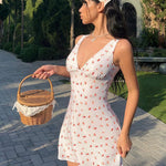 Romantisk kort kjole med landligt blomsterprint og V-hals