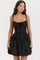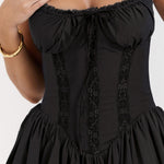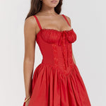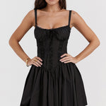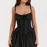 Sexet minikjole med spaghettistropper og blondepaneler, tætsiddende talje