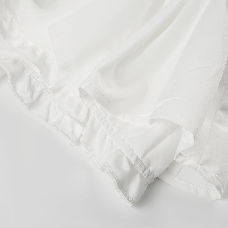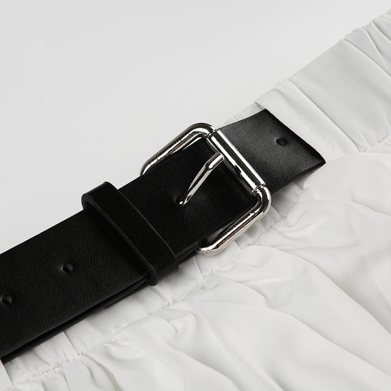 Mini A-formet nederdel med flæser og et lavtaljet bælte med farveblok