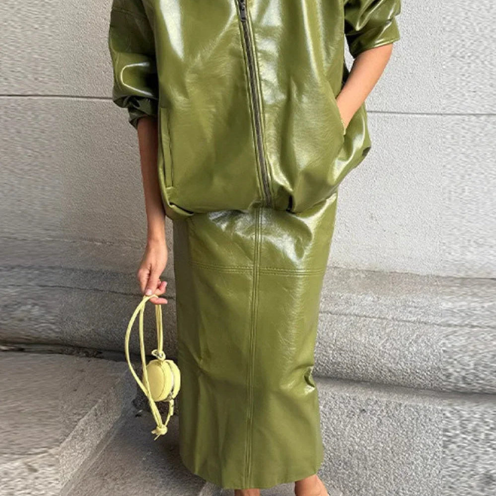 Todelt sæt: elegant jakke og nederdel i ensfarvet laklæder med opretstående krave