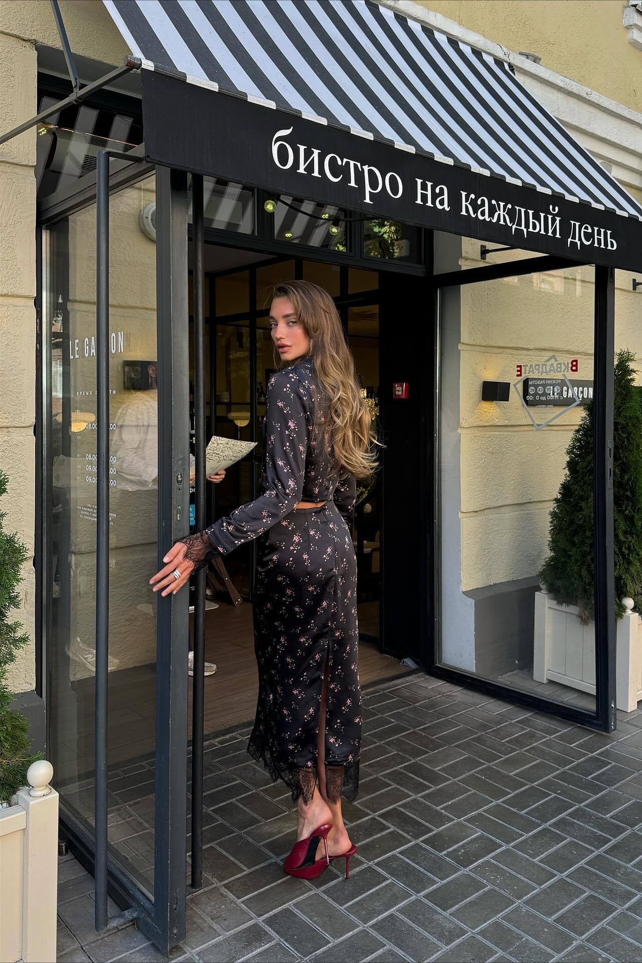 Todelt sæt: blomstret crop top med bindebånd i taljen og tætsiddende nederdel med slids