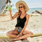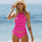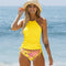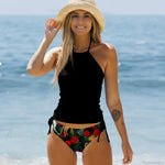 Todelt bikinisæt med rynkede kanter, der fremhæver maven