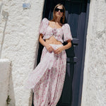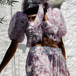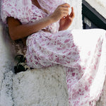 Todelt sæt med lyserødt og hvidt blomsterprint: top med pufærmer og lanternebukser