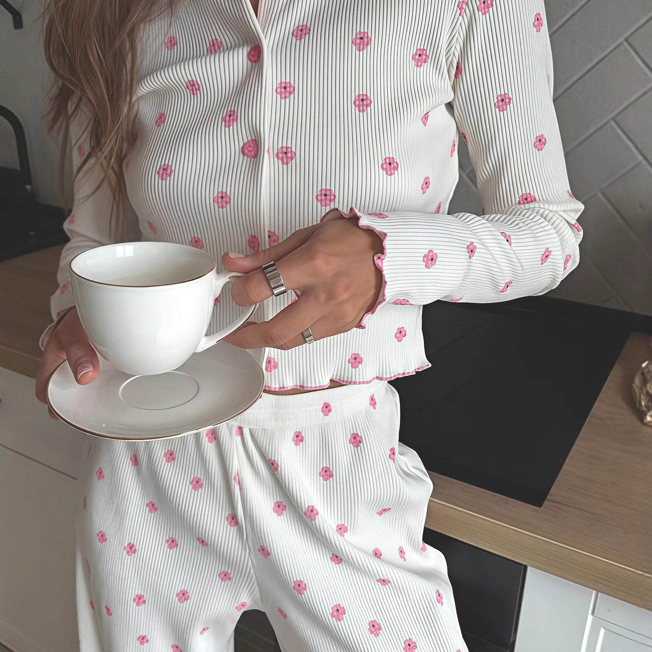Todelt loungewear-sæt med lange ærmer og blomstrede flæser, inklusive bukser og loungewear.