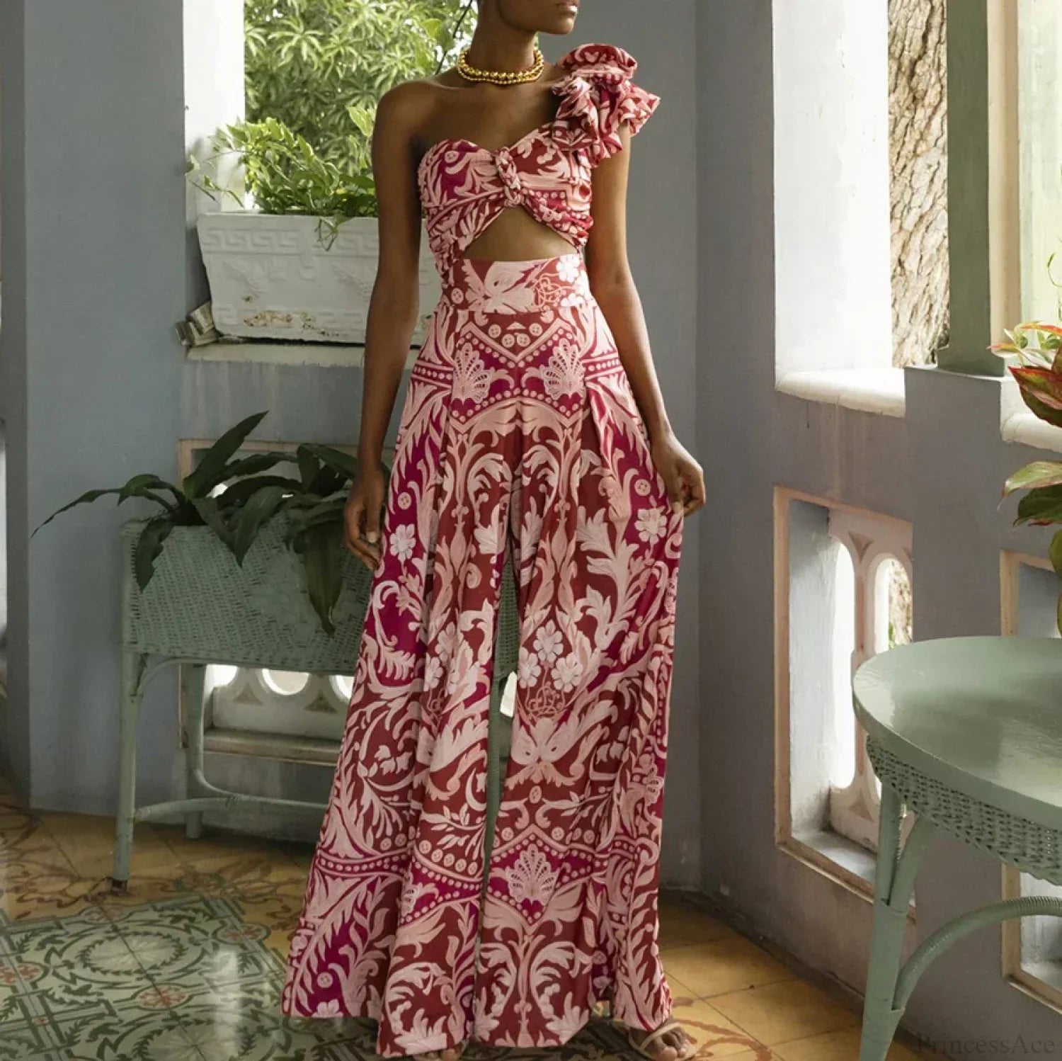 Ærmeløst sæt med én skulder i to dele, lyserødt og lilla blomsterprint